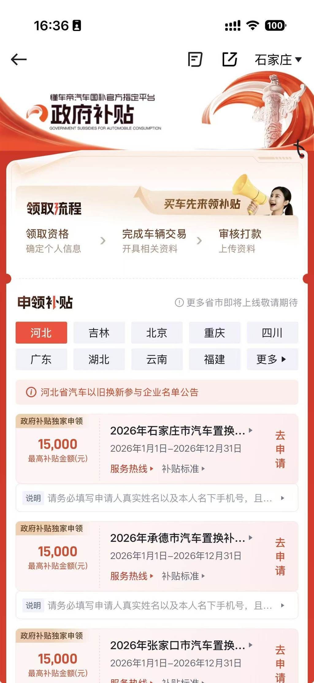 河北开放汽车置换更新补贴申请 2026年河北省汽车置换更新补贴日前在懂车帝App正式开放申请。即日起通过懂车帝App“政府补贴”频道,或搜索“河北省汽车置换更新补贴”即可进入申请页面,最高可享1.5万元现金补贴。
