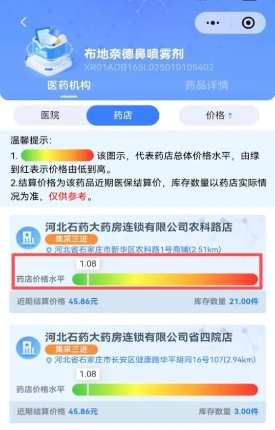 “药店价格热力图”在河北上线 河北省医保局近日上线“药店价格热力图”,已覆盖超2万家药店,通过采集区域内定点药店的药品价格信息,形成反映每家药店药品价格总水平高低的“指数”,并将地图上的药店由绿到红标上颜色,让消费者可以一眼分辨出哪些药店的价格可能更实惠。