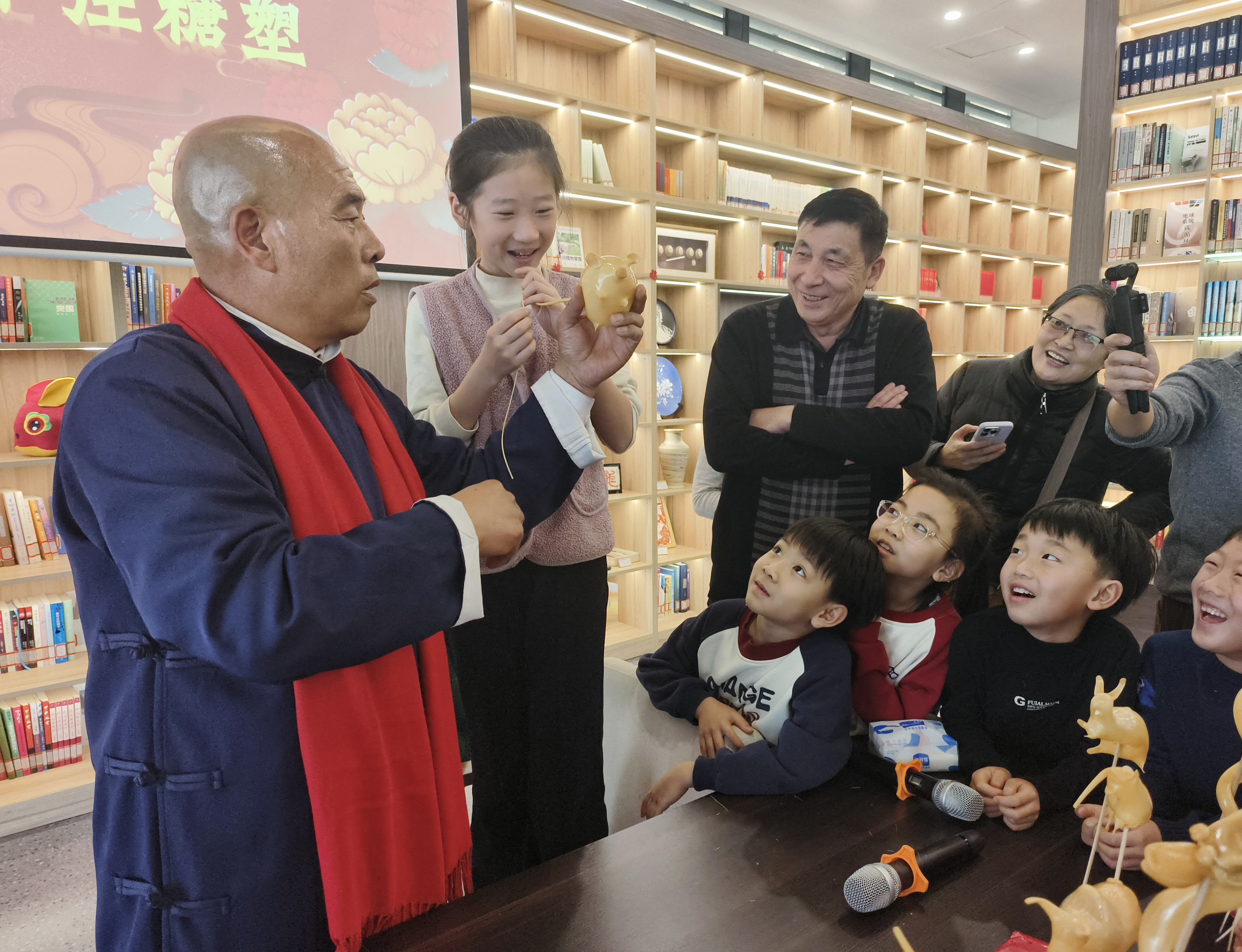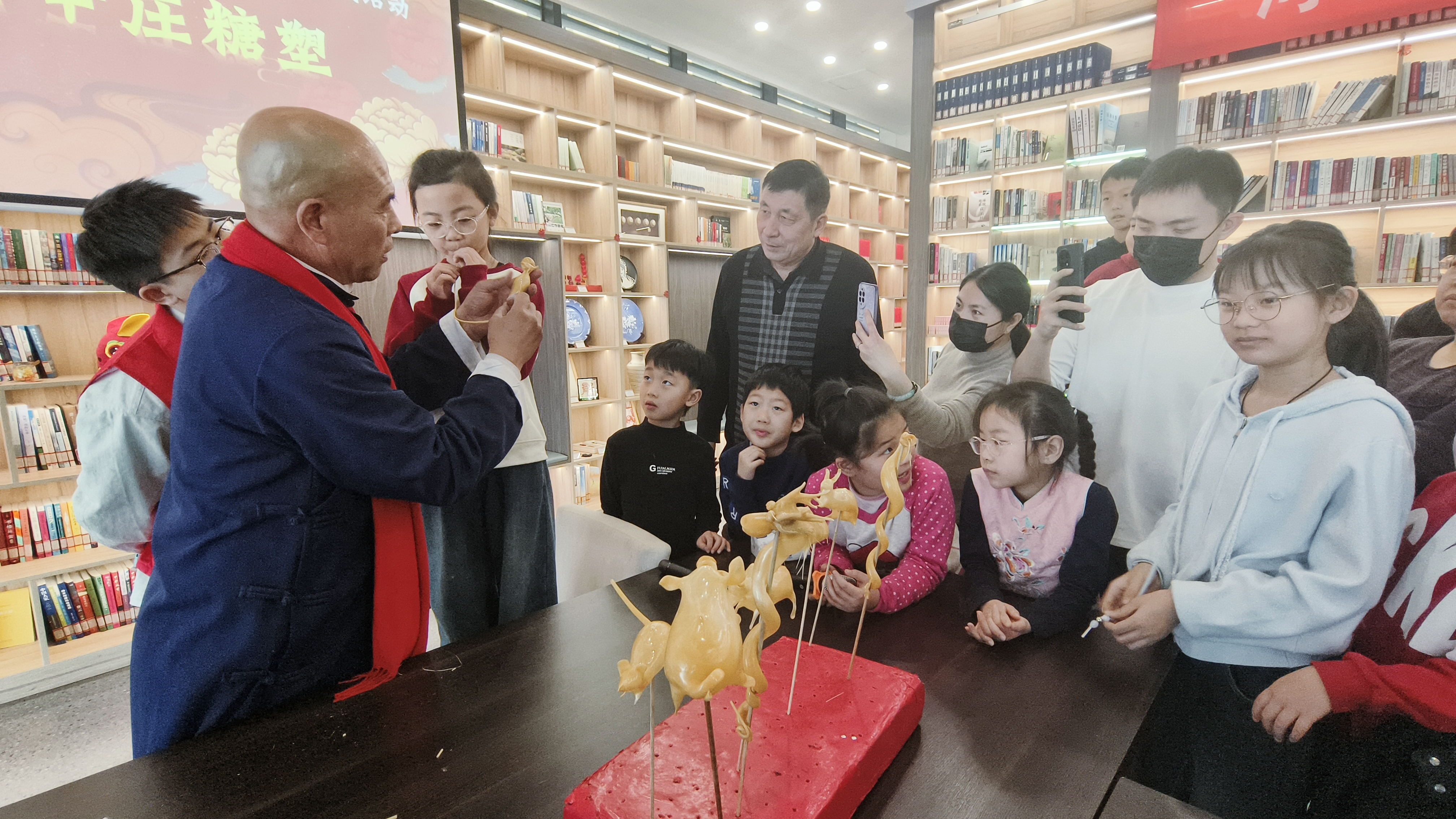 国+社区新媒体报道(张思傲/文 国峰/摄影) 一个恒温炉,一锅麦芽糖,一双巧手,一口“仙气”,软绵香甜的糖球在顷刻间发生神奇变化,小读者们都发出了惊讶的赞叹声,跃跃欲试。2月12日,一场非遗吹糖人民俗体验活动在河北省图书馆“守正书房”举行,传承人与小读者互动,分享吹糖人的制作技巧及要领,让大家近距离感受这项传统技艺的魅力,品味儿时的甜蜜年味。