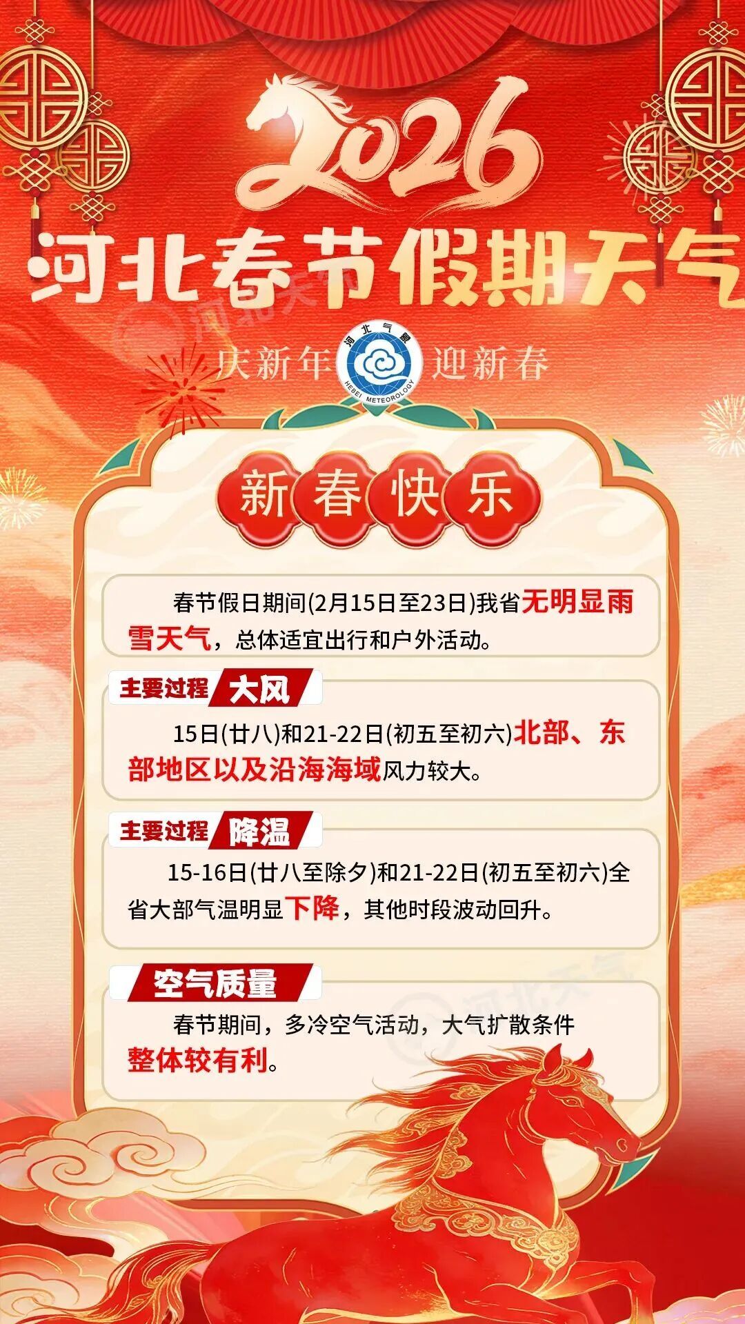 河北春节假期天气出炉 根据河北天气发布的最新天气预报,春节假期期间,河北无明显雨雪天气,总体适宜出行和户外活动!