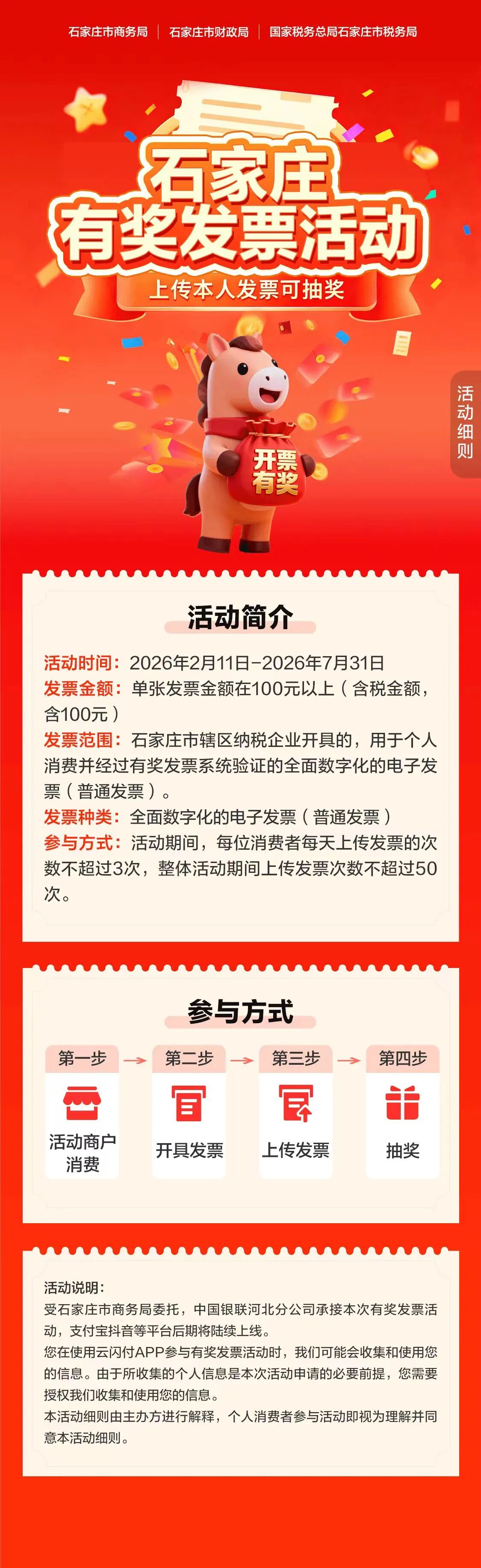 石家庄“有奖发票”促消费活动细则来了 2月11日,石家庄市启动“有奖发票”促消费活动,活动期间,个人消费者在零售、餐饮住宿、旅游等领域消费并开具符合规定的电子发票,即可参与抽奖,单张发票最高可获800元电子红包。