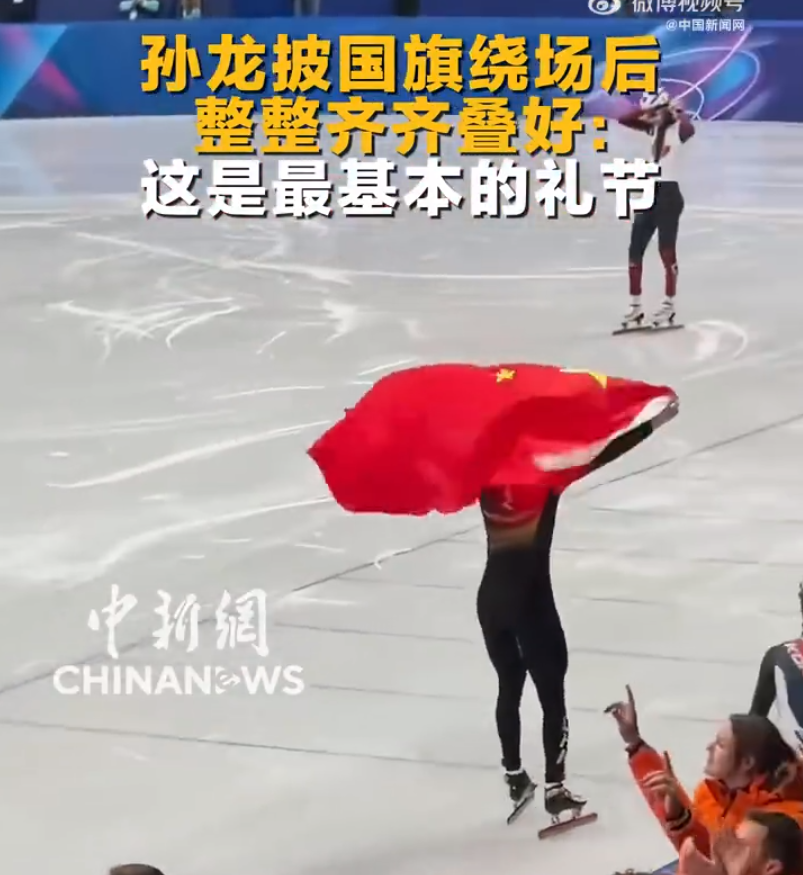 孙龙披国旗绕场后整整齐齐叠好 当地时间12日进行的米兰冬奥会短道速滑男子1000米A组决赛中,中国选手孙龙成绩为1分24秒565,获得银牌。孙龙披国旗绕场后整整齐齐叠好,他表示:这是最基本的礼节。