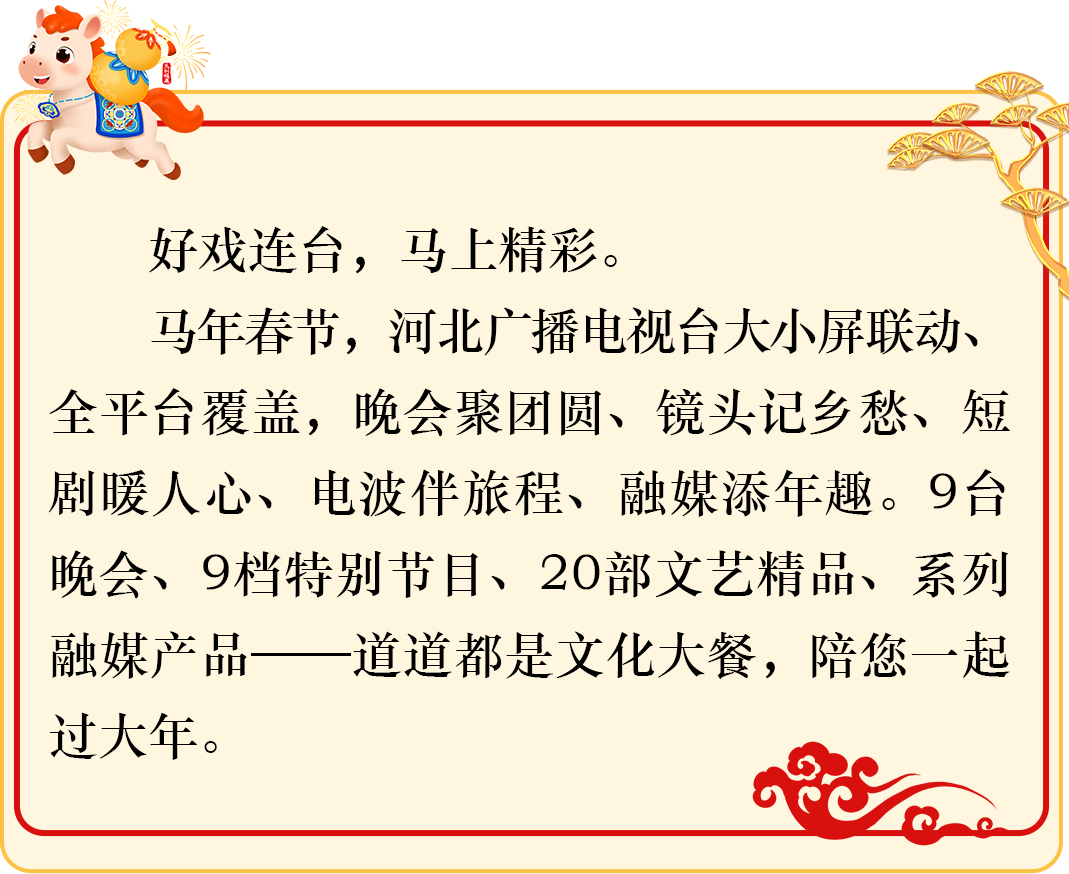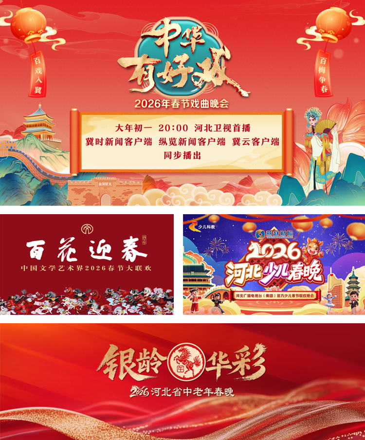 百戏入冀,百梅争春,《中华有好戏》2026年春节戏曲晚会大年初一领衔开锣,38个剧种集中亮相,109朵梅花同台绽放,汇聚全国顶尖阵容,全景呈现中华戏曲盛世风华,倾情打造马年春节最具分量的梨园盛宴!元宵特别节目接续登场,再续戏缘。《2026河北少儿春晚》童趣飞扬,《乐龄迎春·马上接福——2026乐龄春晚》银发欢歌,代际同乐、各美其美。《百花迎春——中国文学艺术界2026春节大联欢》群星云集,《银龄华彩——2026河北省中老年春晚》温情绽放。《最暖的夜》《青春河北》《国潮交响音乐会》暖心重播,精彩延续。好戏连台看不够,老曲新唱乐融融。荧屏内外,皆是合家欢。