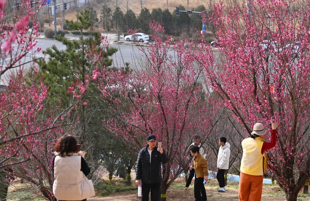 石家庄各大公园广场春花竞相开放 目前,石家庄市区内各大公园广场的迎春花、红梅花和桃花已经盛开,一场姹紫嫣红的“春日盛宴”拉开帷幕。快走出家门,赏花、踏青,畅享美好时光吧!下图为市民在石家庄市梅岭春早公园欣赏盛开的梅花。