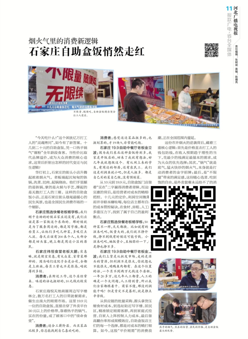 烟火气里的消费新逻辑 石家庄自助盒饭悄然走红 一顿十几元的自助盒饭,看似微不足道,却折射出中国消费市场的深刻变革。理性消费的浪潮,正在重塑各行各业的竞争格局。极致性价比不是低价竞争,而是成本与品质的平衡智慧,是商家对民生需求的精准洞察(识别图片上的二维码关注阅览)。
