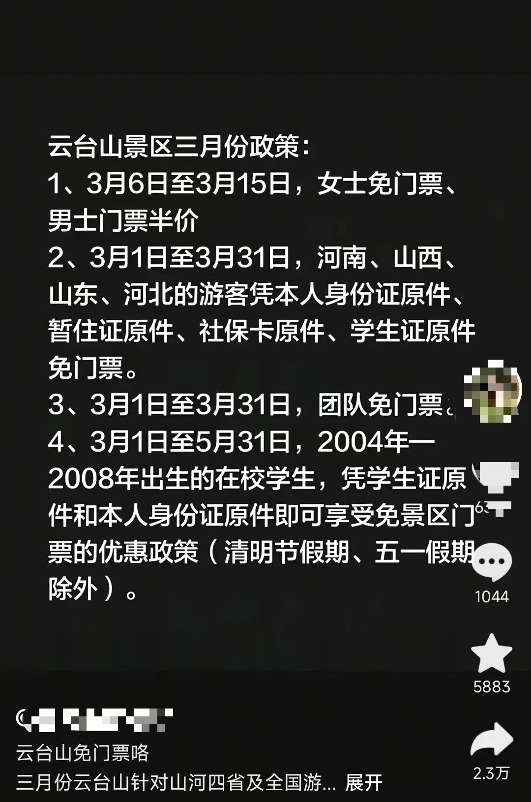河南焦作云台山官宣:3月对“山河四省”游客免票! 2月25日,河南焦作云台山景区宣布3月对河南、山西、山东、河北4个省份免门票。据多家旅行社发布消息,云台山景区三月将有多项门票优惠政策,除针对上述四省份的门票优惠政策,还包括“3月6日至3月15日,女士免门票,男士门票半价”“3月1日至31日,团队免门票”等。不少游客在评论区中表示,对免票政策很期待,希望在三月前往景区游览。