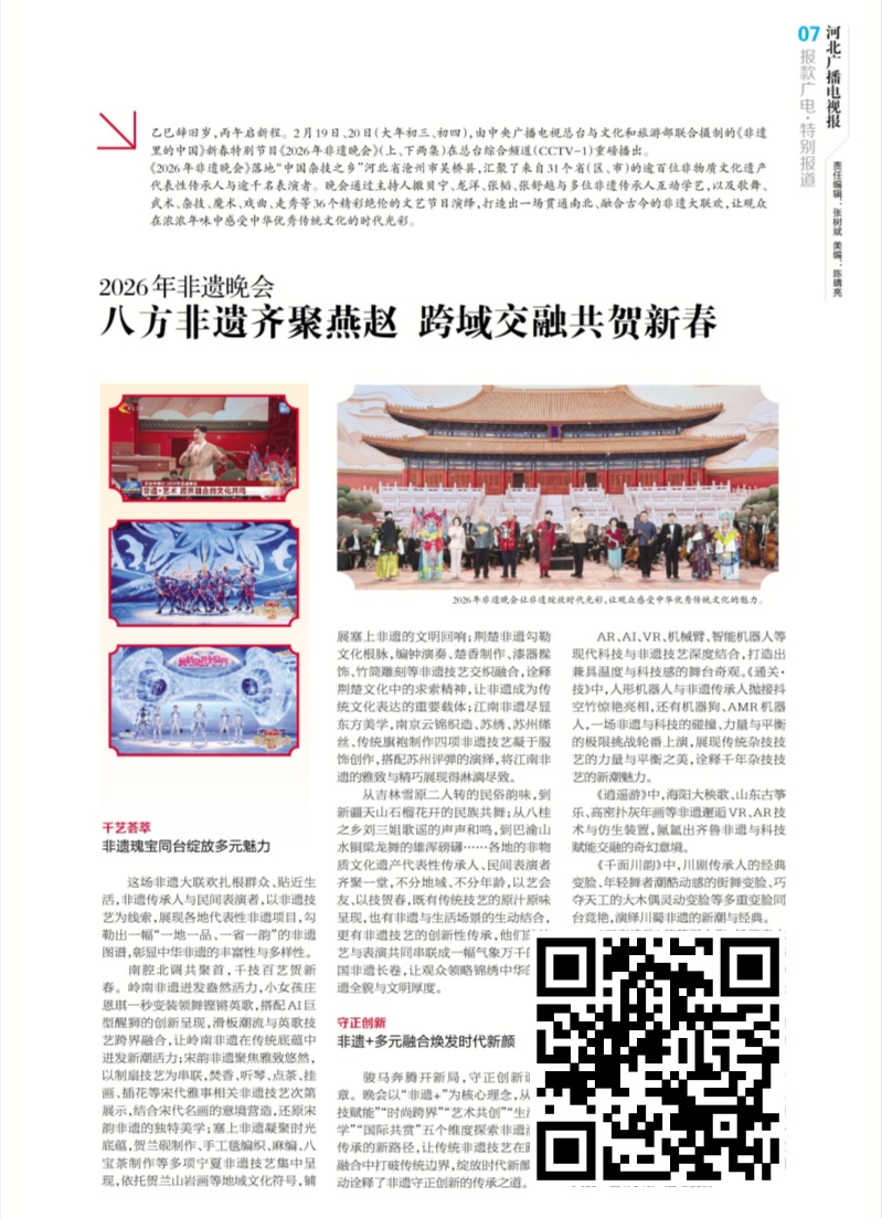 2026年非遗晚会——八方非遗齐聚燕赵 跨域交融共贺新春 《2026年非遗晚会》落地“中国杂技之乡”河北省沧州市吴桥县,汇聚了来自31个省(区、市)的逾百位非物质文化遗产代表性传承人与逾千名表演者。这场非遗大联欢扎根群众、贴近生活,非遗传承人与民间表演者,以非遗技艺为线索,展现各地代表性非遗项目,勾勒出一幅“一地一品、一省一韵”的非遗图谱,彰显中华非遗的丰富性与多样性(识别图片上的二维码关注阅览)。
