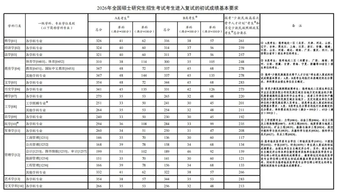 2026年考研国家线公布 2月28日,教育部发布《2026年全国硕士研究生招生考试考生进入复试的初试成绩基本要求》(国家分数线)。各招生单位根据《2026年全国硕士研究生招生工作管理规定》,在国家分数线的基础上,自主确定并公布报考本单位的考生进入复试的初试成绩要求及其他学术要求。“中国研究生招生信息网”中“调剂意向采集系统”将于3月27日开通,已完成一志愿录取的招生单位可发布调剂信息,有调剂意愿的考生可查询、填报意向信息。“调剂服务系统”将于4月8日开通。招生单位在第一志愿合格生源不足时,可组织开展调剂工作。招生单位接受所有考生(含报考“退役大学生士兵计划”与普通计划之间调剂的考生等)调剂申请均须通过教育部“调剂服务系统”进行。