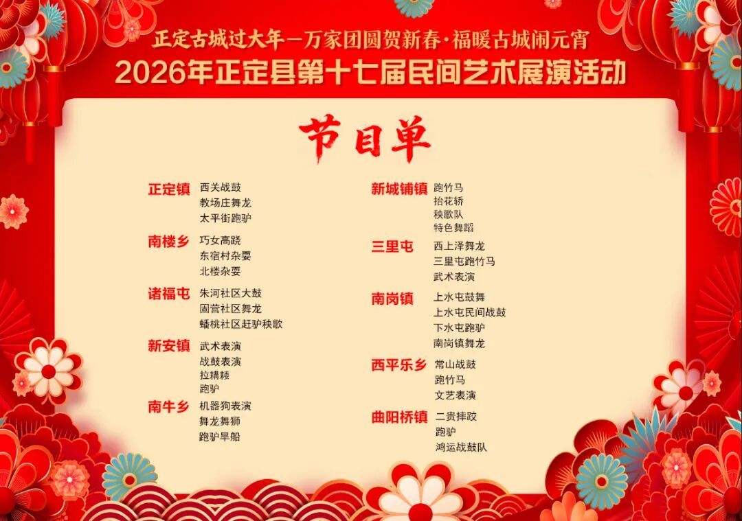 河北:特色活动闹元宵 2026正定县第十七届民间艺术展演3月3日(正月十五)隆重启幕,汇聚正定县各乡镇、街道办事处三十余支特色队伍,常山战鼓、跑竹马、抬花轿、舞龙舞狮、高跷等表演轮番登场。这个元宵节,邯郸广府古城精彩不停。全城太极展演、开城迎宾、打铁花、火壶、变脸……非遗好戏轮番登场。易县恋乡·太行水镇易水集开启元宵盛宴,七大主题活动热闹不停。正月十五闹元宵,崆山白云洞景区精心策划“花灯映洞天,崆山元宵花灯喜乐会”系列活动,将于3月3日精彩上演。日间畅猜全城灯谜,夜间穿梭于华灯幻影间,来万全右卫城感受沉浸式的元宵盛会。新春佳节,“2026自豪正定 迎春游园会”在正定古城南门城墙引爆游览热潮。