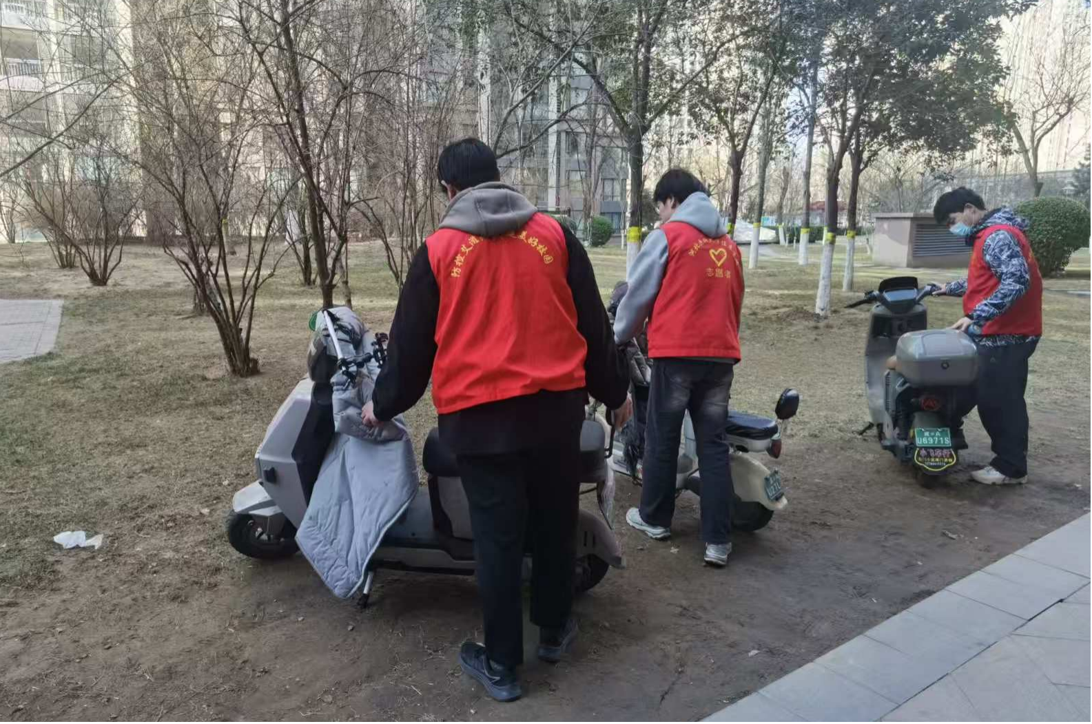 另一组志愿者负责非机动车规范摆放工作,针对社区内在草坪、绿地上乱停乱放,占用消防通道和无障碍通道的自行车、电动车进行集中整理,将车辆有序摆放至指定停车区域,同时主动劝导不规范停车行为。