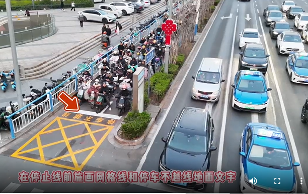 非机动车停止线后移,石家庄中山路与建设大街交叉口有新变化 为了进一步优化路口通行秩序,近日,石家庄市公安局交通管理局长安交管大队对中山路与建设大街交叉口实施了非机动车停止线后移的工作措施。改造前,非机动车停止线紧临人行横道,车辆等灯时容易越线,挤占人行横道或阻挡右转车辆视线。改造后,将非机动车停止线在原有的基础上后移3至5米,在停止线前施画黄色网格线和“停车不越线”地面文字,引导非机动车驾驶员在新的停止线处等候,增加了路口的缓冲空间,减少了非机动车聚集和行人的交织冲突,同时也保障了右转机动车通行顺畅。