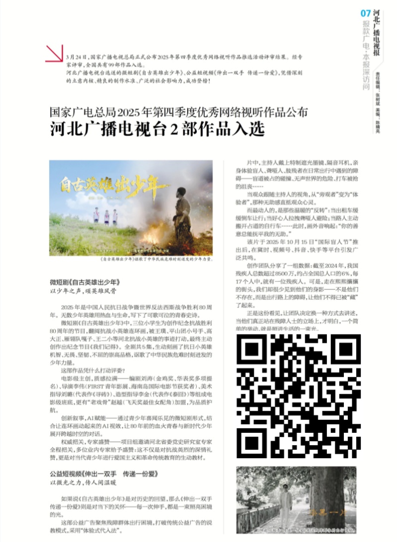 河北广电2部作品入选国家广电总局2025年第四季度优秀网络视听作品 河北广播电视台选送的微短剧《自古英雄出少年》、公益短视频《伸出一双手 传递一份爱》,凭借深刻的立意内核、精良的制作水准、广泛的社会影响力,成功登榜(识别图片上的二维码关注阅览)。