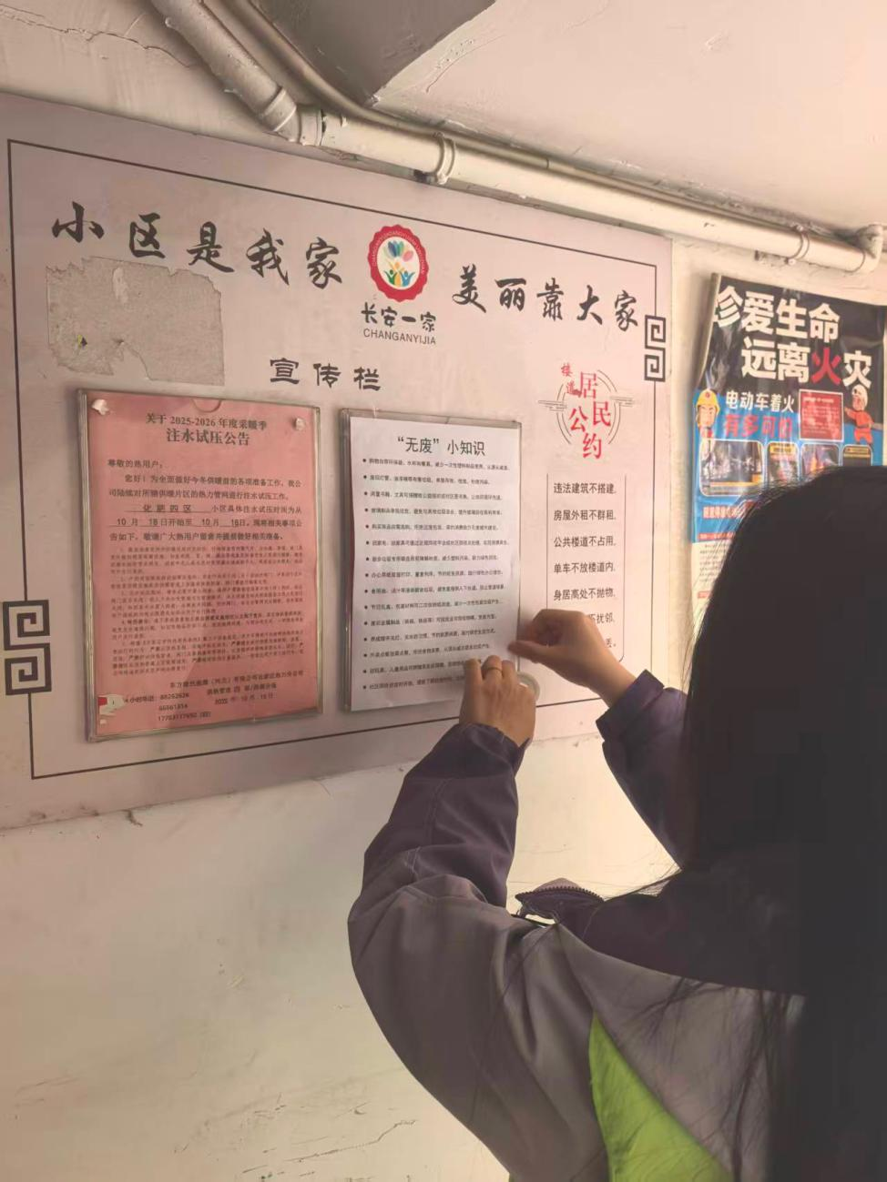 为实现宣传全覆盖,社区工作人员和志愿者深入辖区各楼栋,在单元门、楼道墙面等显著位置张贴无废知识宣传页,内容涵盖无废城市的内涵、日常生活中的无废小技巧、废旧物品再利用方法等,让居民在上下楼、进出单元门时就能便捷学习无废知识。与此同时,在小区人员密集场所向过往行人发放宣传资料,耐心解答居民关于无废生活、垃圾分类、旧物处置等方面的疑问,引导居民树立“垃圾是放错位置的资源”的理念。