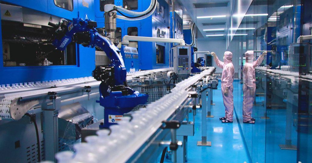 石家庄四药集团员工在数智化输液生产线上作业。
