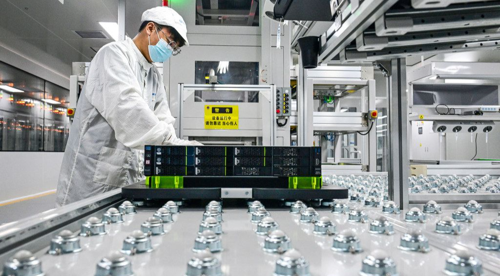 在雄安科创中心中试基地,雄安百信信息科技有限公司工人在服务器生产线上工作。