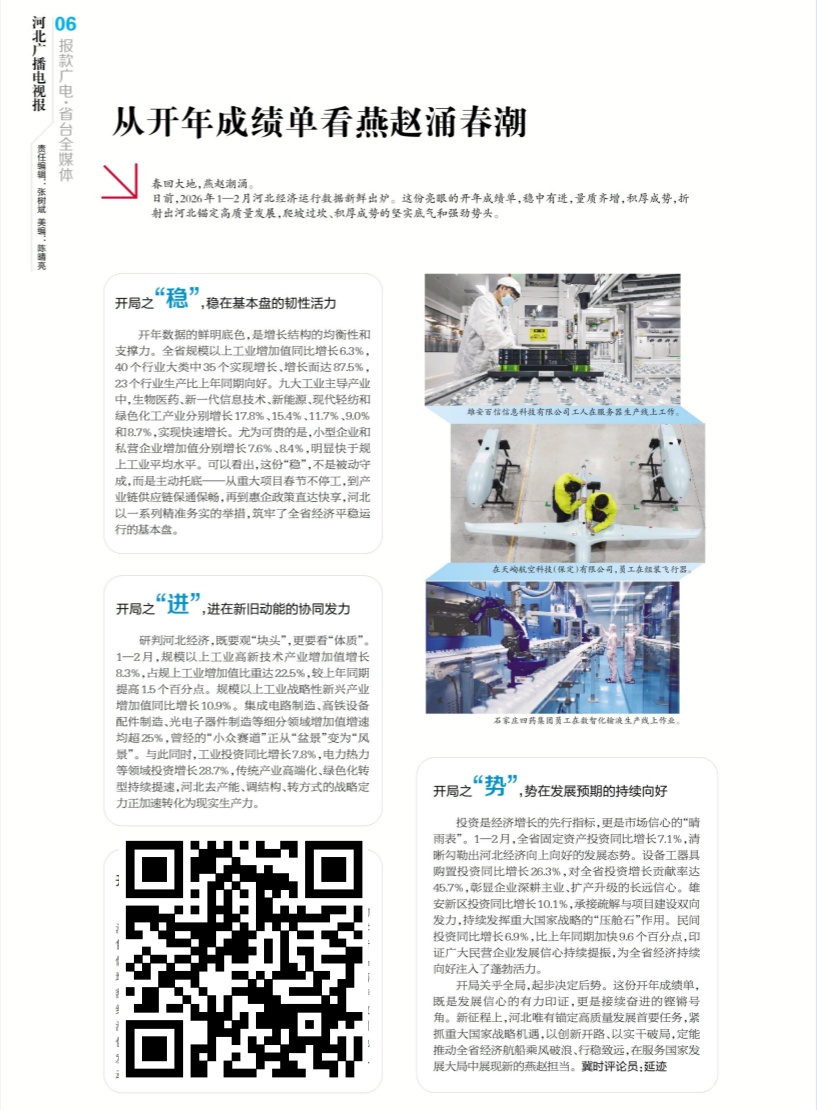从开年成绩单看燕赵涌春潮 日前,2026年1—2月河北经济运行数据新鲜出炉。这份亮眼的开年成绩单,稳中有进,量质齐增,积厚成势,折射出河北锚定高质量发展,爬坡过坎、积厚成势的坚实底气和强劲势头(识别图片上的二维码关注阅览)。