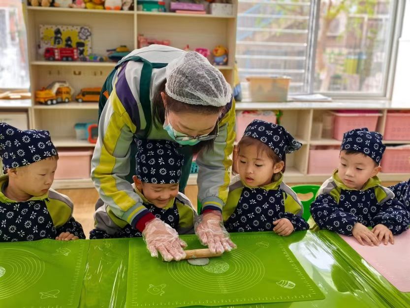 制作环节中,老师与社区志愿者手把手指导孩子们揉面团、包馅料、搓青团,从揉面力度到包馅技巧,耐心细致逐一示范。萌娃们化身“小小青团师”,戴上小头巾、穿上小围裙,认真跟着步骤操作,揉面、包馅、搓圆,动作虽略显稚嫩,却个个专注投入、兴致盎然。现场欢声笑语不断,清新艾草香弥漫教室,孩子们在亲手制作中感受传统美食的乐趣,也加深了对清明文化的认知与理解。