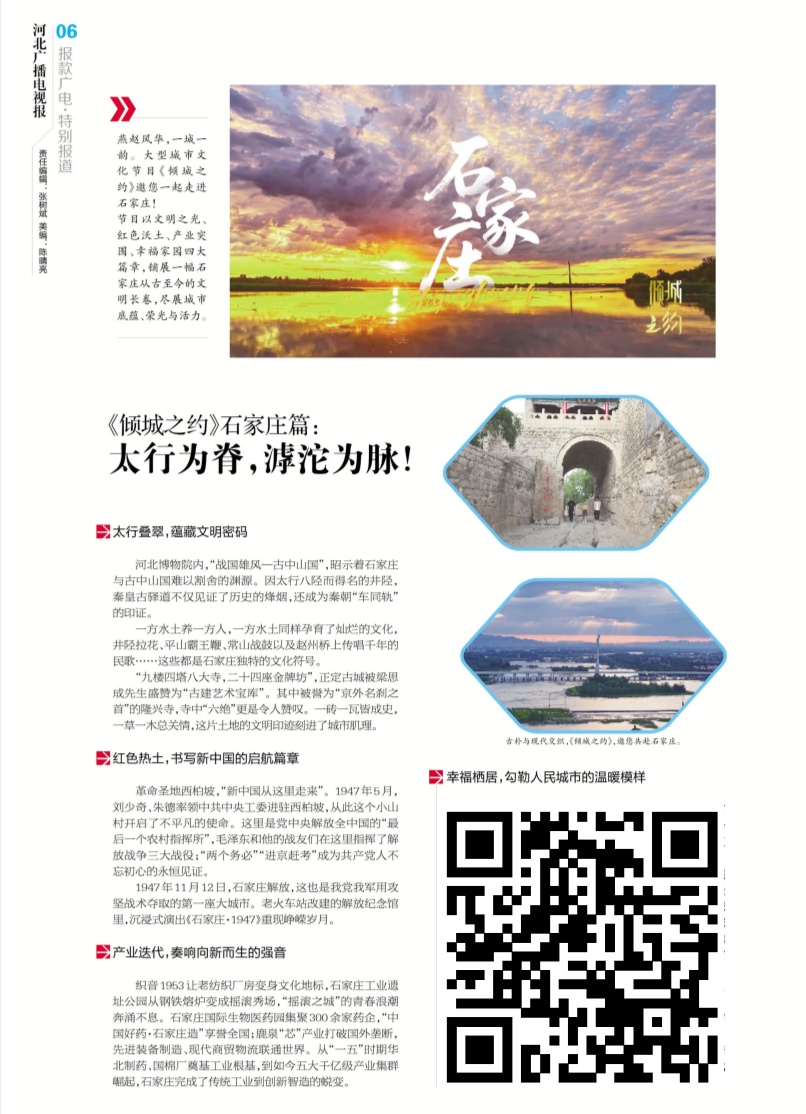 《倾城之约》石家庄篇:太行为脊,滹沱为脉! 节目以文明之光、红色沃土、产业突围、幸福家园四大篇章,铺展一幅石家庄从古至今的文明长卷,尽展城市底蕴、荣光与活力(识别图片上的二维码关注阅览)。
