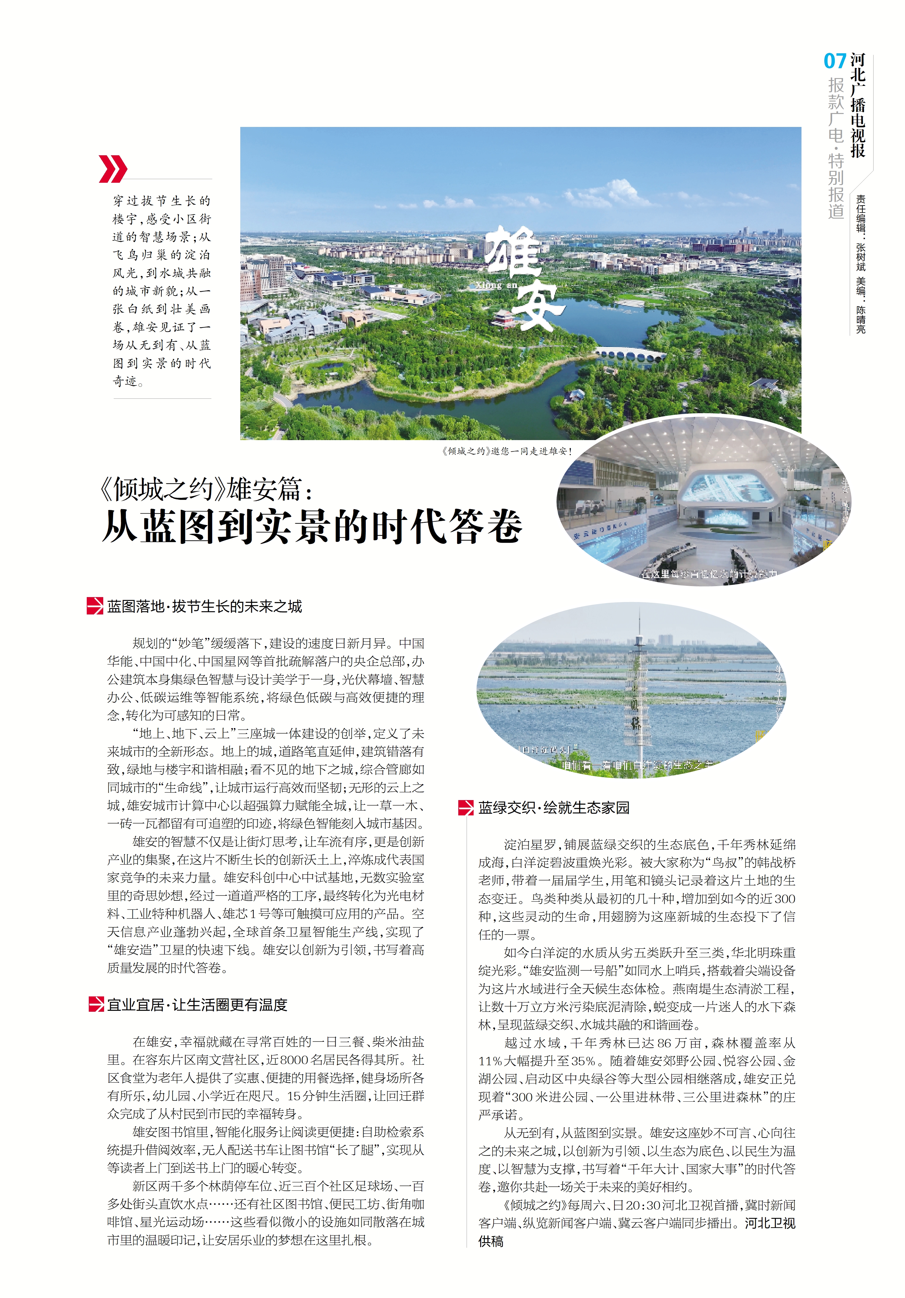 穿过拔节生长的楼宇,感受小区街道的智慧场景;从飞鸟归巢的淀泊风光,到水城共融的城市新貌;从一张白纸到壮美画卷,雄安见证了一场从无到有、从蓝图到实景的时代奇迹。
