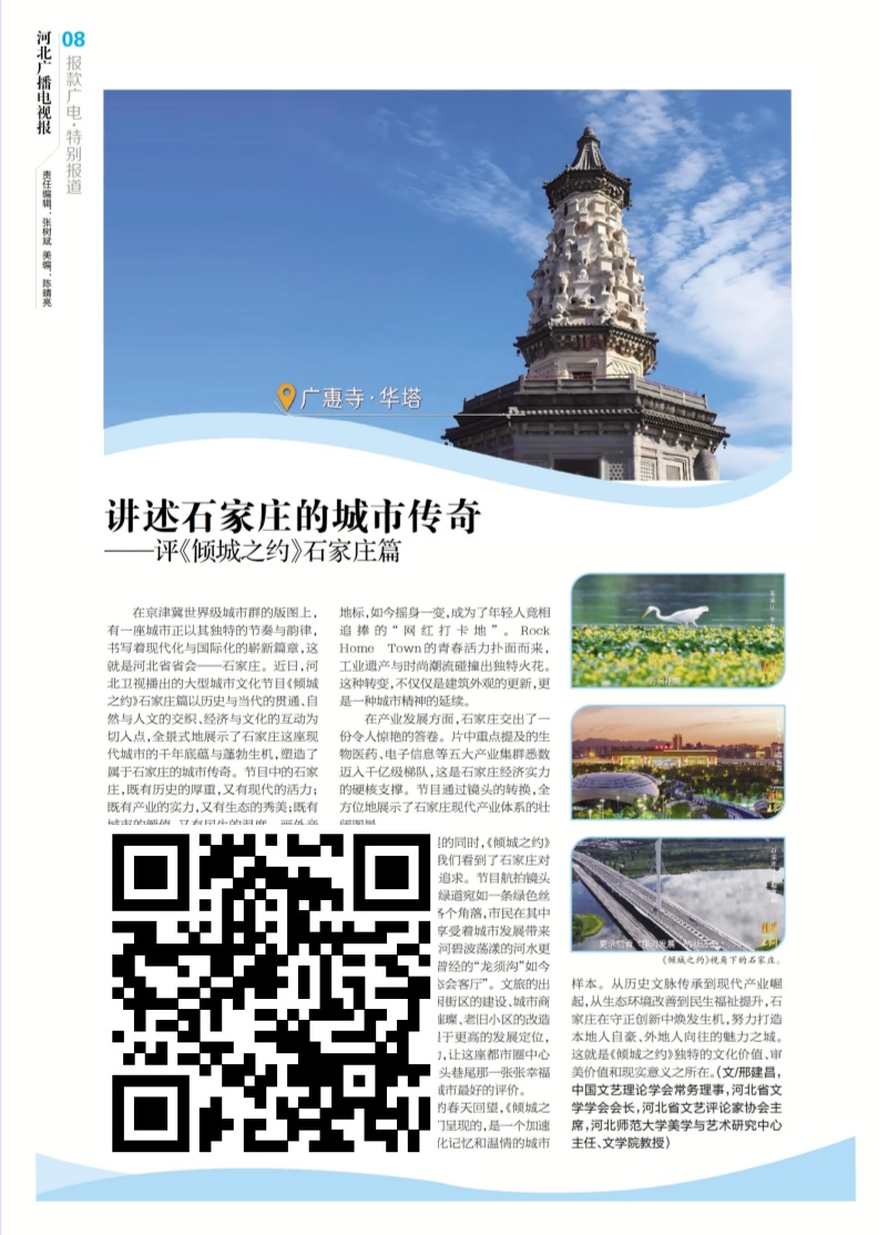 讲述石家庄的城市传奇——评《倾城之约》石家庄篇 近日,河北卫视播出的大型城市文化节目《倾城之约》石家庄篇以历史与当代的贯通、自然与人文的交织,经济与文化的互动为切入点,全景式地展示了石家庄这座现代城市的千年底蕴与蓬勃生机,塑造了属于石家庄的城市传奇(识别图片上的二维码关注阅览)。