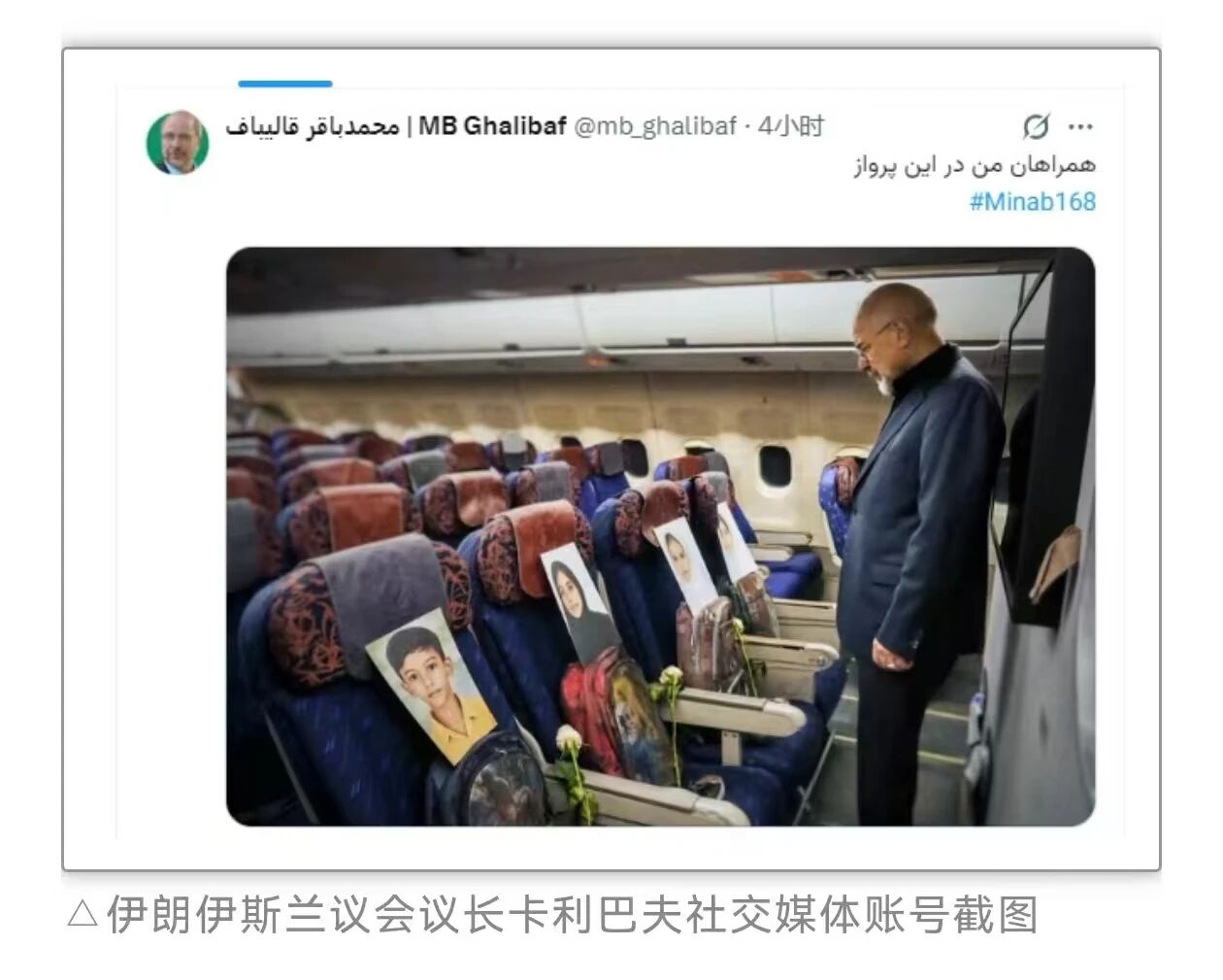 伊朗代表团的飞机上,摆放着孩子们的照片和书包 当地时间11日凌晨,由伊朗伊斯兰议会议长卡利巴夫率领的伊朗代表团抵达巴基斯坦伊斯兰堡,将与美方进行谈判。卡利巴夫当天在自己的社交媒体账号发了一张照片,并配文“我的飞行同伴们”“米纳卜168”。照片上的卡利巴夫一身正装,低头注视着客舱前排座椅。这些座椅上摆放着的是四名遇难儿童的照片和书包。“米纳卜168”,意指遭袭伊朗米纳卜小学遇难的168名儿童。