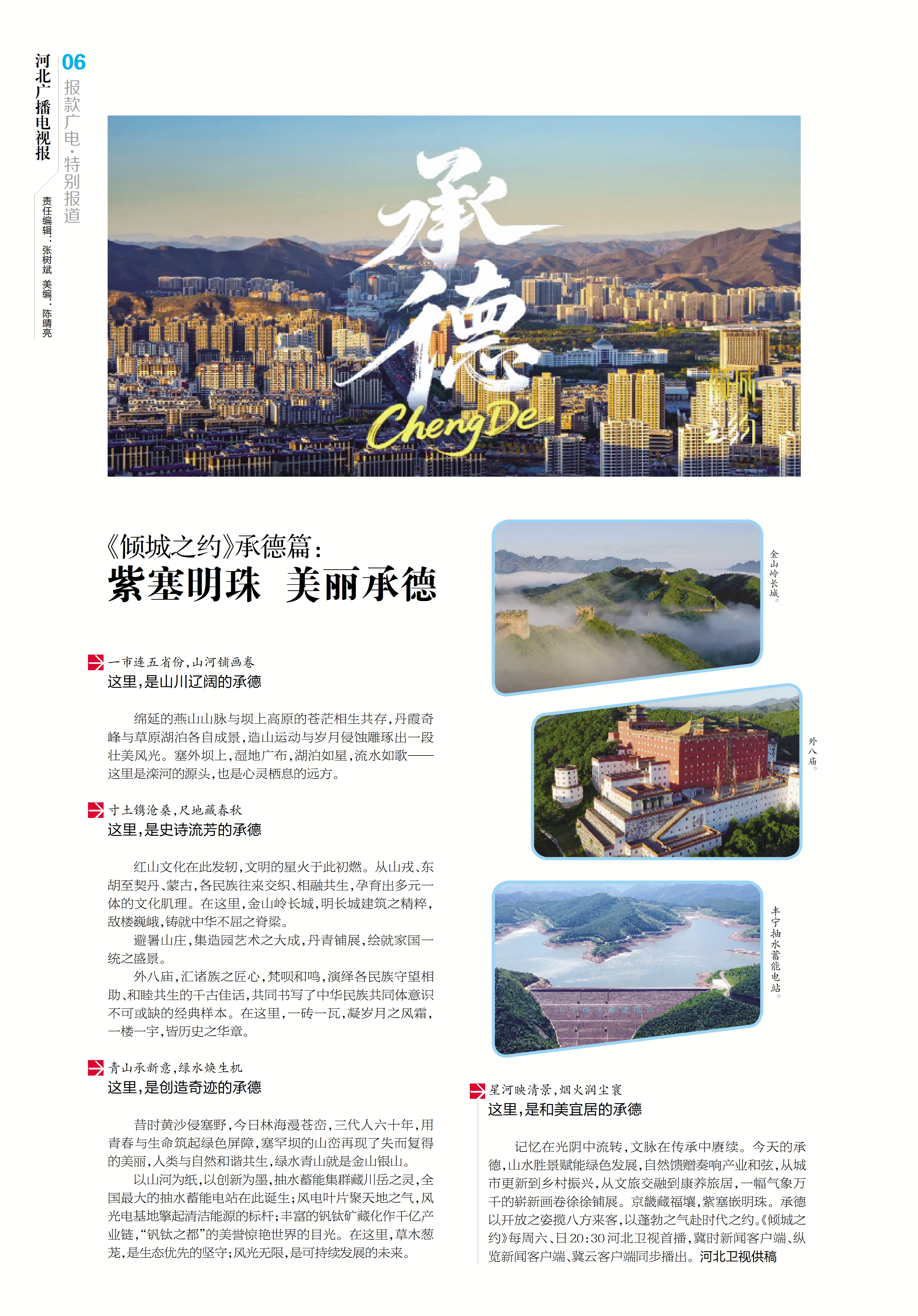 记忆在光阴中流转,文脉在传承中赓续。今天的承德,山水胜景赋能绿色发展,自然馈赠奏响产业和弦,从城市更新到乡村振兴,从文旅交融到康养旅居,一幅气象万千的崭新画卷徐徐铺展。京畿藏福壤,紫塞嵌明珠。承德以开放之姿揽八方来客,以蓬勃之气赴时代之约。《倾城之约》每周六、日20:30河北卫视首播,冀时新闻客户端、纵览新闻客户端、冀云客户端同步播出。