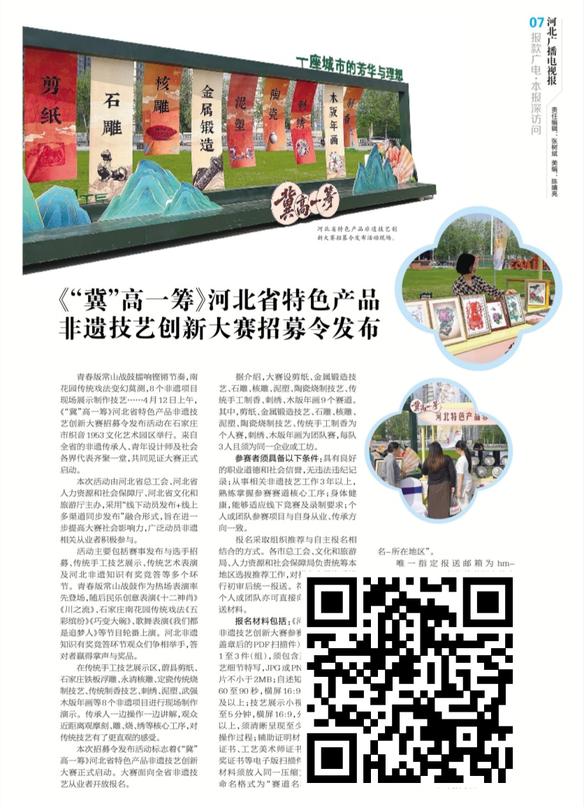 《“冀”高一筹》河北省特色产品非遗技艺创新大赛招募令发布 据介绍,大赛设剪纸、金属锻造技艺、石雕、核雕、泥塑、陶瓷烧制技艺、传统手工制香、刺绣、木版年画9个赛道。其中,剪纸、金属锻造技艺、石雕、核雕、泥塑、陶瓷烧制技艺、传统手工制香为个人赛,刺绣、木版年画为团队赛,每队3人且须为同一企业或工坊(识别图片上的二维码关注阅览)。