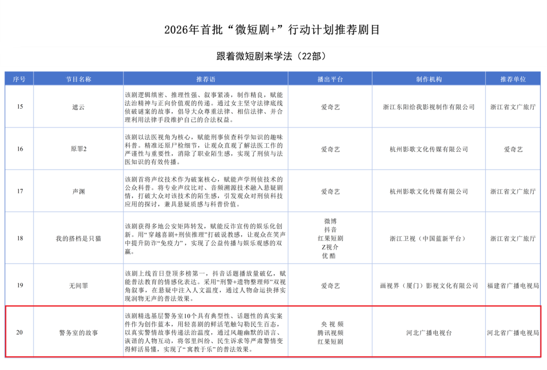 国+社区新媒体报道 4月15日,在第十三届中国网络视听大会微短剧高质量发展论坛上,国家广电总局发布了2026年首批“微短剧+”行动计划推荐剧目,由河北广播电视台出品的网络微短剧《警务室的故事》入选“跟着微短剧来学法”系列。
