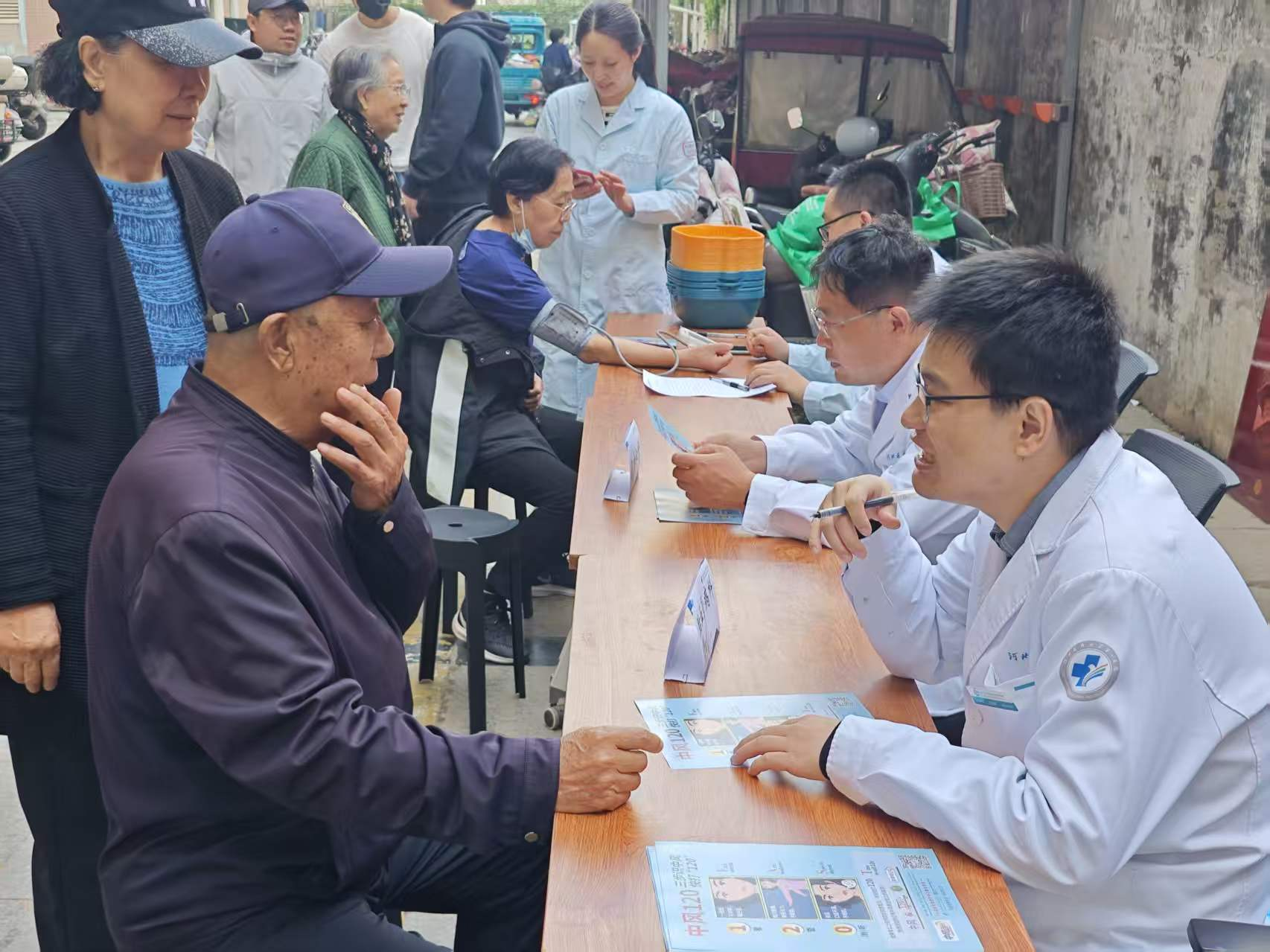 活动现场设在东方明珠社区广场。来自社区卫生中心和医大一院的心血管、内分泌等科室的医务人员一早便搭起义诊台,为陆续前来的老年居民测量血压、血糖,耐心解答高血压、糖尿病、关节炎等常见慢性病的日常管理问题。