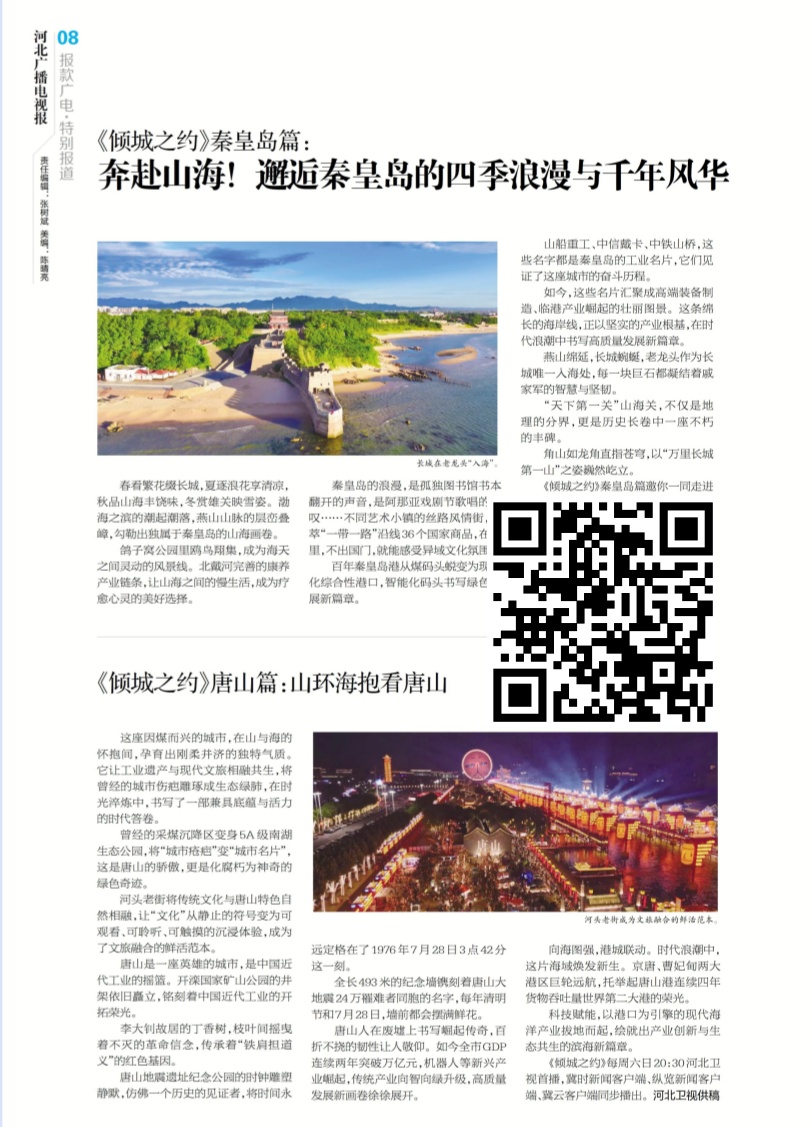 《倾城之约》秦皇岛篇:奔赴山海!邂逅秦皇岛的四季浪漫与千年风华/唐山篇:山环海抱看唐山 春看繁花缀长城,夏逐浪花享清凉,秋品山海丰饶味,冬赏雄关映雪姿。渤海之滨的潮起潮落,燕山山脉的层峦叠嶂,勾勒出独属于秦皇岛的山海画卷。唐山这座因煤而兴的城市,在山与海的怀抱间,孕育出刚柔并济的独特气质。它让工业遗产与现代文旅相融共生,将曾经的城市伤疤雕琢成生态绿肺,在时光淬炼中,书写了一部兼具底蕴与活力的时代答卷(识别图片上的二维码关注阅览)。