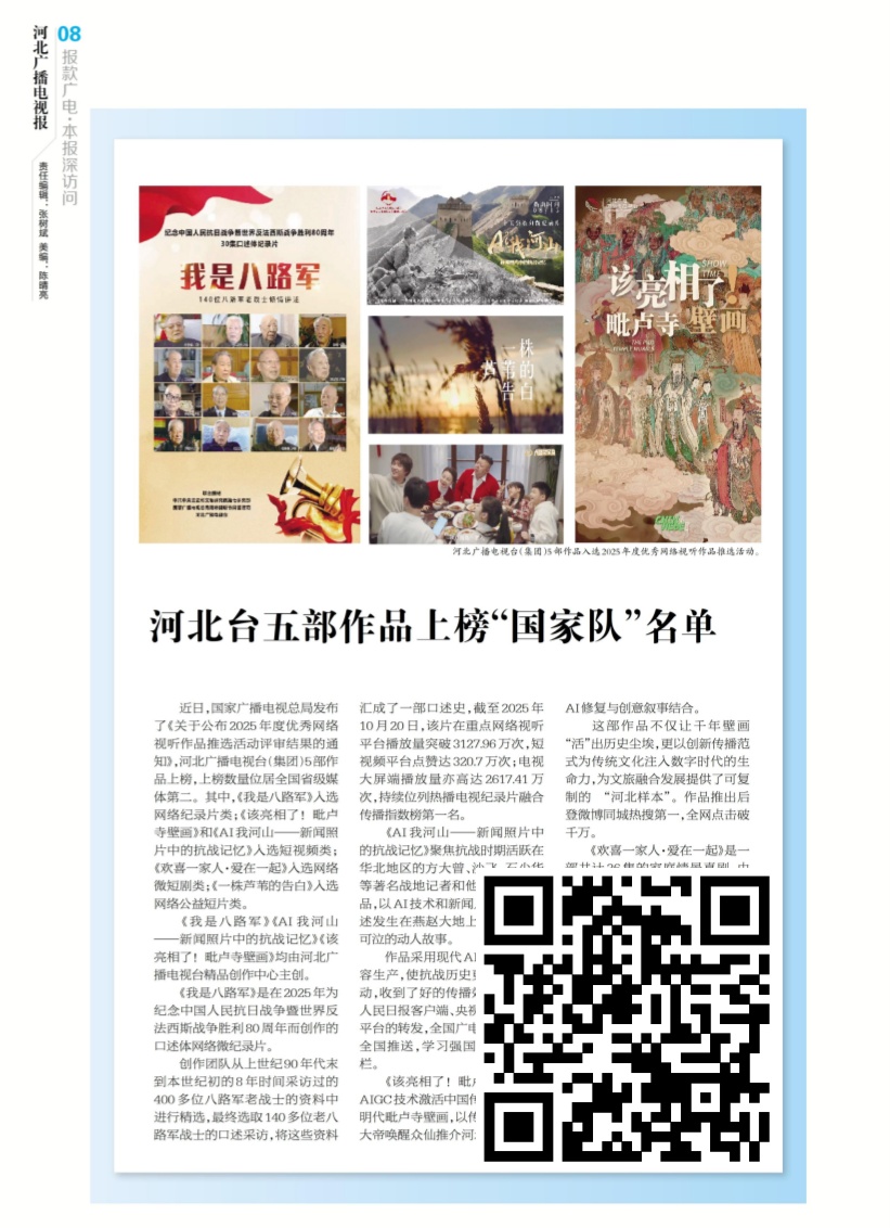 全国第二,河北台五部上榜!国家广电总局2025年度优秀网络视听作品推选活动结果揭晓 近日,国家广播电视总局发布了《关于公布2025年度优秀网络视听作品推选活动评审结果的通知》,河北广播电视台(集团)5部作品上榜,上榜数量位居全国省级媒体第二。其中,《我是八路军》入选网络纪录片类;《该亮相了!毗卢寺壁画》和《AI我河山——新闻照片中的抗战记忆》入选短视频类;《欢喜一家人· 爱在一起》入选网络微短剧类;《一株芦苇的告白》入选网络公益短片类(识别图片上的二维码关注阅览)。