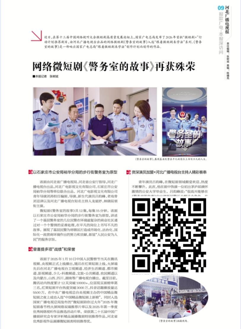 河北台网络微短剧《警务室的故事》入选广电总局2026年首批“微短剧+”行动计划推荐剧目 在第十三届中国网络视听大会微短剧高质量发展论坛上,国家广电总局发布了2026年首批“微短剧+”行动计划推荐剧目,由河北广播电视台出品的网络微短剧《警务室的故事》入选“跟着微短剧来学法”系列(识别图片上的二维码关注阅览)。