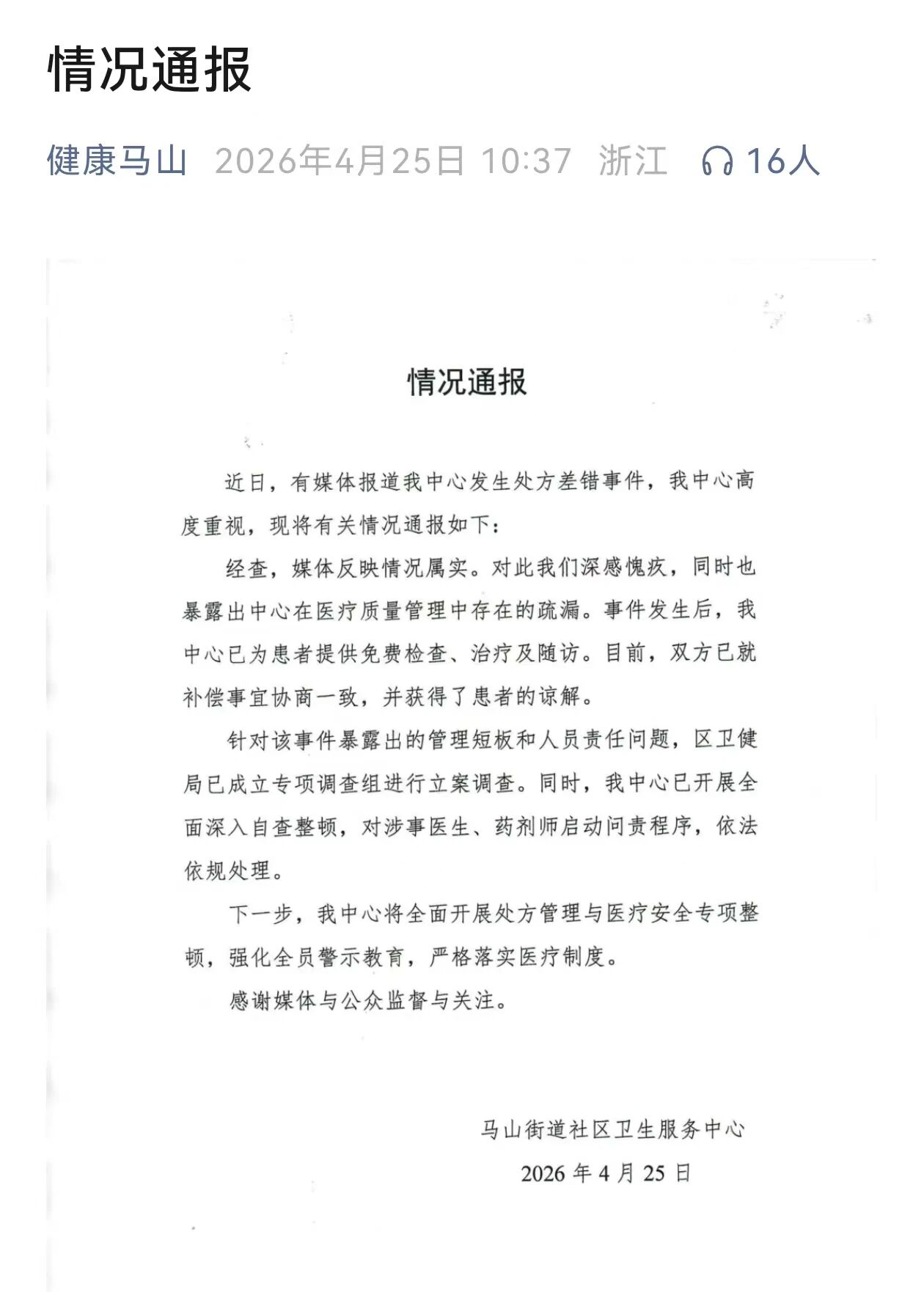 医生错把2粒写成21粒,患者一天吃了42粒药…… 浙江绍兴应大妈因脚部受伤,到街道社区卫生服务中心就医,结果院方开错了一种口服药的剂量,一次2粒变成了一次21粒。当天应大妈分两次共吃了42粒,觉得难受想吐。她回到该卫生中心,经确认该药品应当是每次服用2粒,随即院方给应大妈做了身体检查,血常规结果基本正常,葡萄糖和乳酸脱氢酶两项指标超标。4月25日,浙江绍兴马山街道社区卫生服务中心就“医生将2粒药写成21粒,患者服药后身体不适”一事发布情况通报。