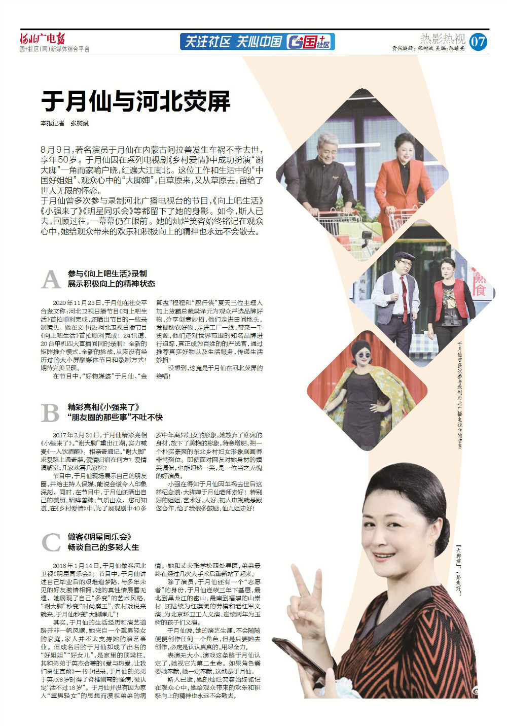 8月9日,著名演员于月仙在内蒙古阿拉善发生车祸不幸去世,享年50岁。于月仙因在系列电视剧《乡村爱情》中成功扮演“谢大脚”一角而家喻户晓,红遍大江南北。这位工作和生活中的“中国好姐姐”、观众心中的“大脚婶”,自草原来,又从草原去,留给了世人无限的怀恋。